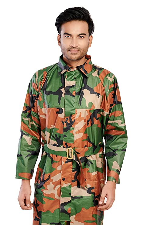 Aristocrat Rainwear Mens Army Print Long Raincoat Waterproof with Collar Adjustable Hood and Full Sleeve Stylish Full Workwear Barsati Rain Suit with Pockets and Belt