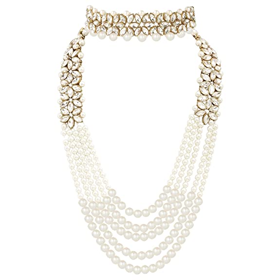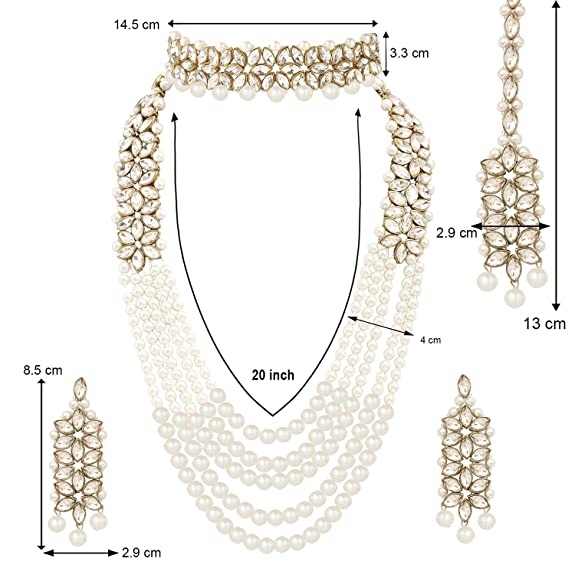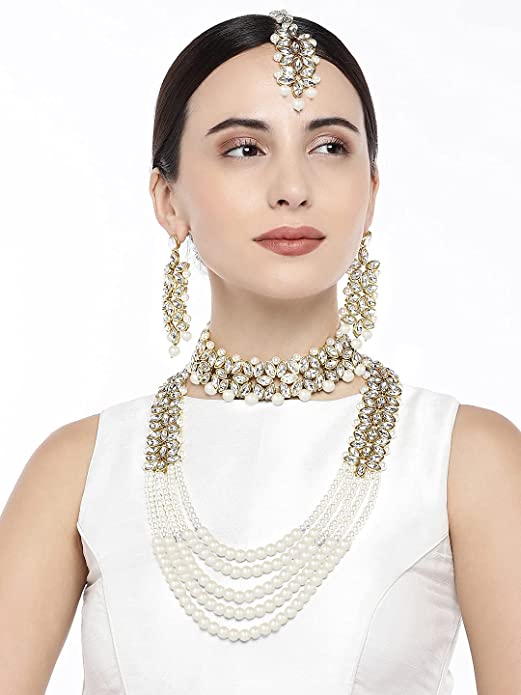 Peora Gold Plated Crystal Pearl Wedding Bridal Necklace Jewellery Set with Earring Maang Tikka for Women Girls