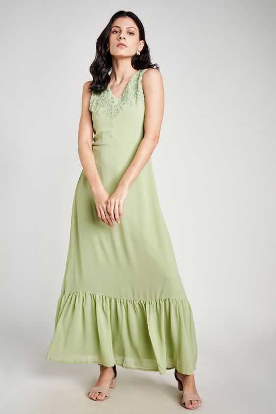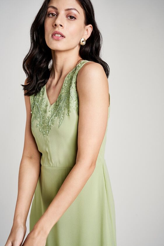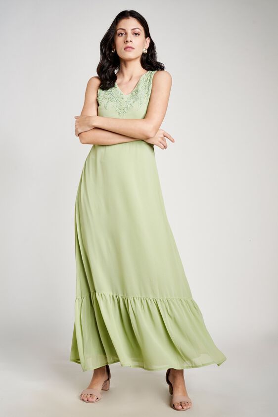 Shine out through the festivities with this stunning Sage Green Gown. It is sleeveless with V neck and beautiful embroidery. Just pair it with matching accessories to complete your look. Go ahead and shop for this one-piece gown here.